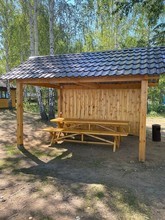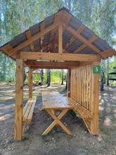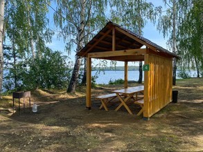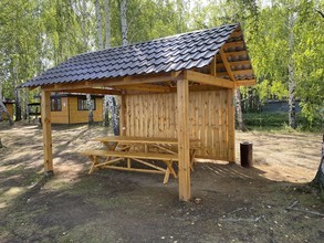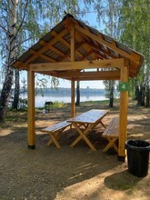Для большой компании и проведения пышных торжеств на территории базы отдыха есть павильон. Он представляет собой капитальную конструкция с полом. Стены павильона можно регулировать по желанию и погоде. В помещении проведено водоснабжение, есть столы, стулья, холодильник и чайник. Снаружи установлен мангал.