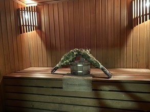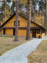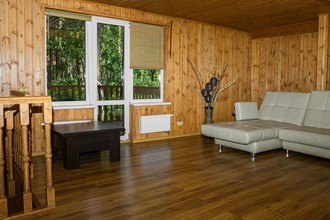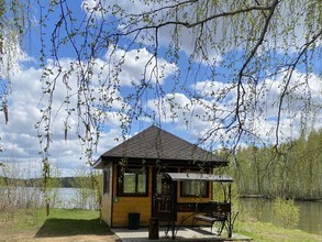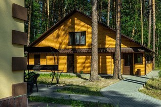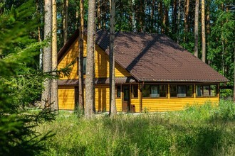 Для любителей жаркого пара есть дом с баней из бруса. На первом этаже находиться большая закрытая веранда с вместительным столом и скамейками и кухня с холодильником, гарнитуром и посудой. Хорошенько попарить вы сможете в русской бане на дровах с зоной для помывки, а затем расслабиться в комнате отдыха. Для полного эффекта стоит приобрести у администрации натуральный берёзовый веник. На втором этаже разместилась гостиная с диваном, телевизором и балконом и спальная комната с двуспальной кроватью.